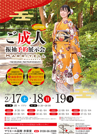 2023.11.24 ご成人振袖予約展示会開催のご案内 2024年2月17日(土)・18日(日)・19日(月) (株)函館平安システム主催「ご成人振袖予約展示会」を開催いたします。 平成16年4月2日〜平成17年4月1日生まれの方が対象。 完全予約制になっております。ぜひこの機会にご覧ください。