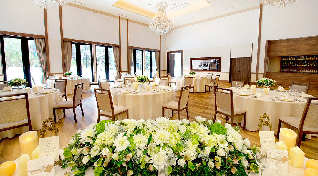 壁一面の大きな窓から望む緑豊かなガーデンとあたたかな陽光ふりそそぐ、明るく華やかな貸切邸宅バンケット。